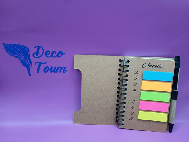 Carnet kraft de 50 pages avec post-it (5 couleurs) couverture personnalisable fourni avec stylo personnalisable également.